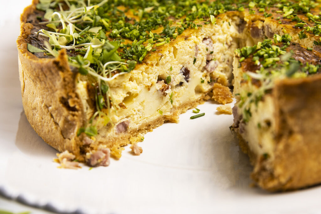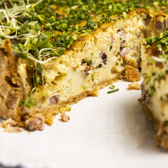 A franciák tojásos lepénye az 1950-es években került Amerikába, és a helyiek egyből a szívükbe zárták. Ezen nincs is mit csodálkozni, hiszen a klasszikus quiche lorraine elengedhetetlen elemei a tojás mellett a tejszín, bacon, svájci gruyere és/vagy ementáli sajt – szóval egy fullos reggeli ígéretével kecsegtetnek. A sima quiche pedig még nagyobb teret enged a szabadságnak, mert kerülhet bele bármilyen hús vagy sajt féle: sonka, kolbász, kecskesajt, parmezán, feta, cheddar, zöldségek stb. Én most annyit csalok ebben az ételben, hogy bacon mellett kevés házi sonkát is kockázok, és mivel ez nagyon sós, ezért alma ciderrel kompenzálok.